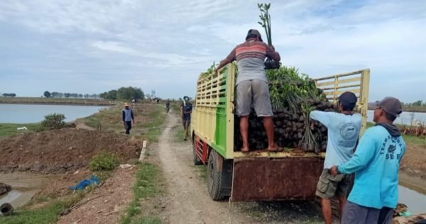(Above) Mangrove seedlings were delivered to the meeting point near Tegalombo Village’s coastal area in Pati Regency. They were then transported to the planting location by members of a fishpond farmer group collaborating with Trees4Trees as tree growers. (Below) The mangrove distribution process in Banyutowo Village involved the active participation of the local community.
