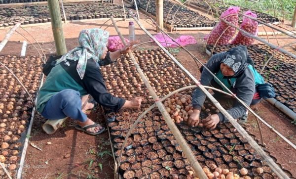 At the Kebumen nursery, a new tree-seedling has been introduced. This year, the nursery has started on the cultivation of the cotton tree, also known in Indonesia as the randu tree or kapuk tree. The decision to grow cotton trees is a response to the strong interest of the local community in Kebumen, driven by the economic value of the tree. Cotton trees produce fibers which are contained in their fruits, and these fibers are essential raw materials for textile yarn. (Above) New shoots of randu tree-seedling have begun to grow. (Below) A nursery worker is removing weeds from the randu tree seedlings to ensure the maximum growth.