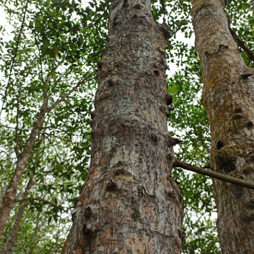 Rhizopora apiculata grows with height up to 30 meters. The trunk diameter of a mature tree can reach 50 meters. It has typically dark greyish color with distinctive root system that can reach 5 meters length. Sometimes, this species also has aerial roots that come out from the branches.